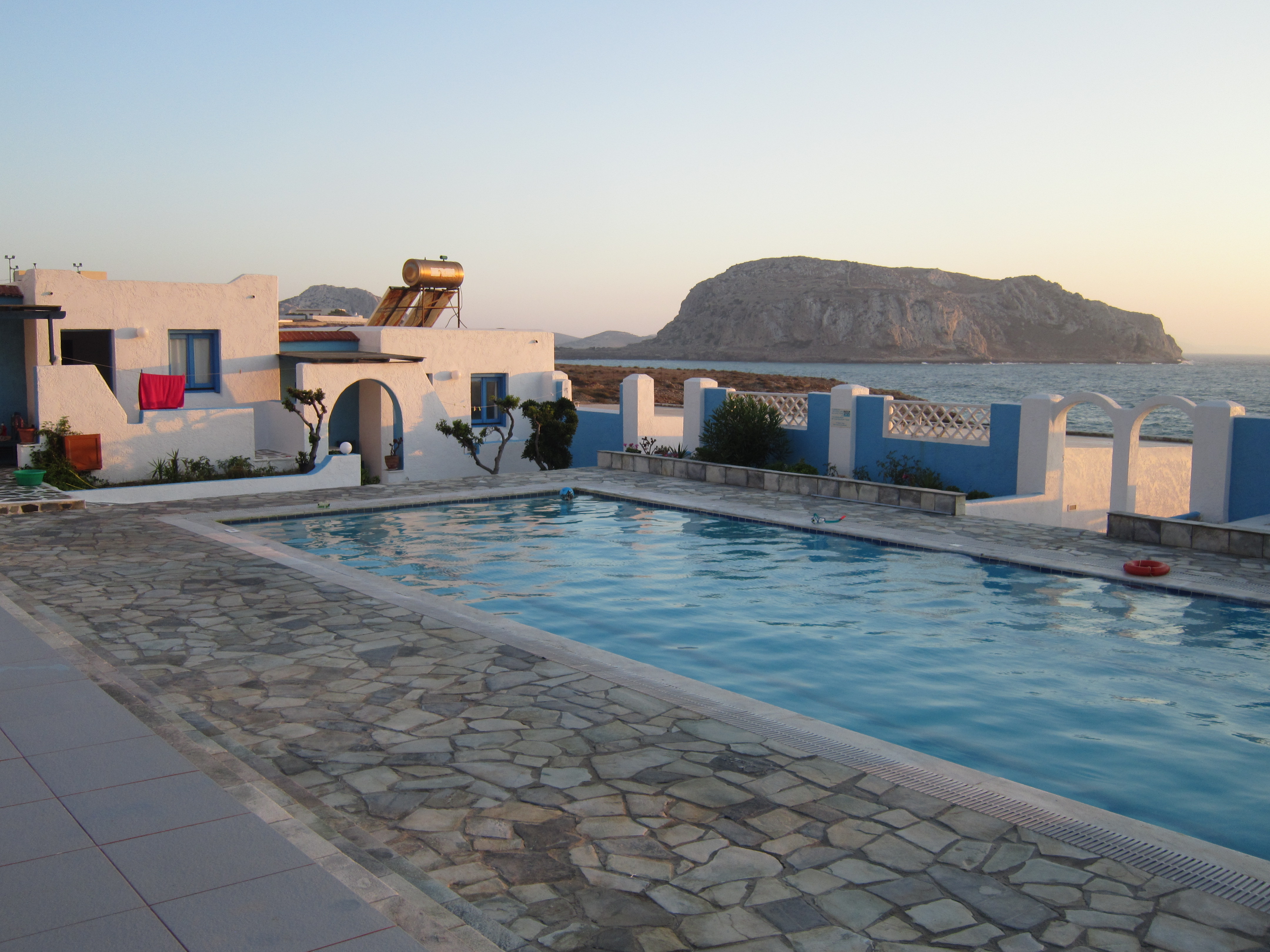 3) Tipo di Alloggio (e relativo prezzo…). Per noi CinqueNelMondo, la sistemazione-tipo greca, cioè uno studio con 1 camera + 3 letti in soggiorno e angolo cottura, è la sistemazione perfetta: più spaziosa e sfruttabile di una camera d’albergo, meno costosa di un appartamento…e poi, se a 55 euro a notte mi regalano anche la piscina e un tramonto sul mare come questo….
