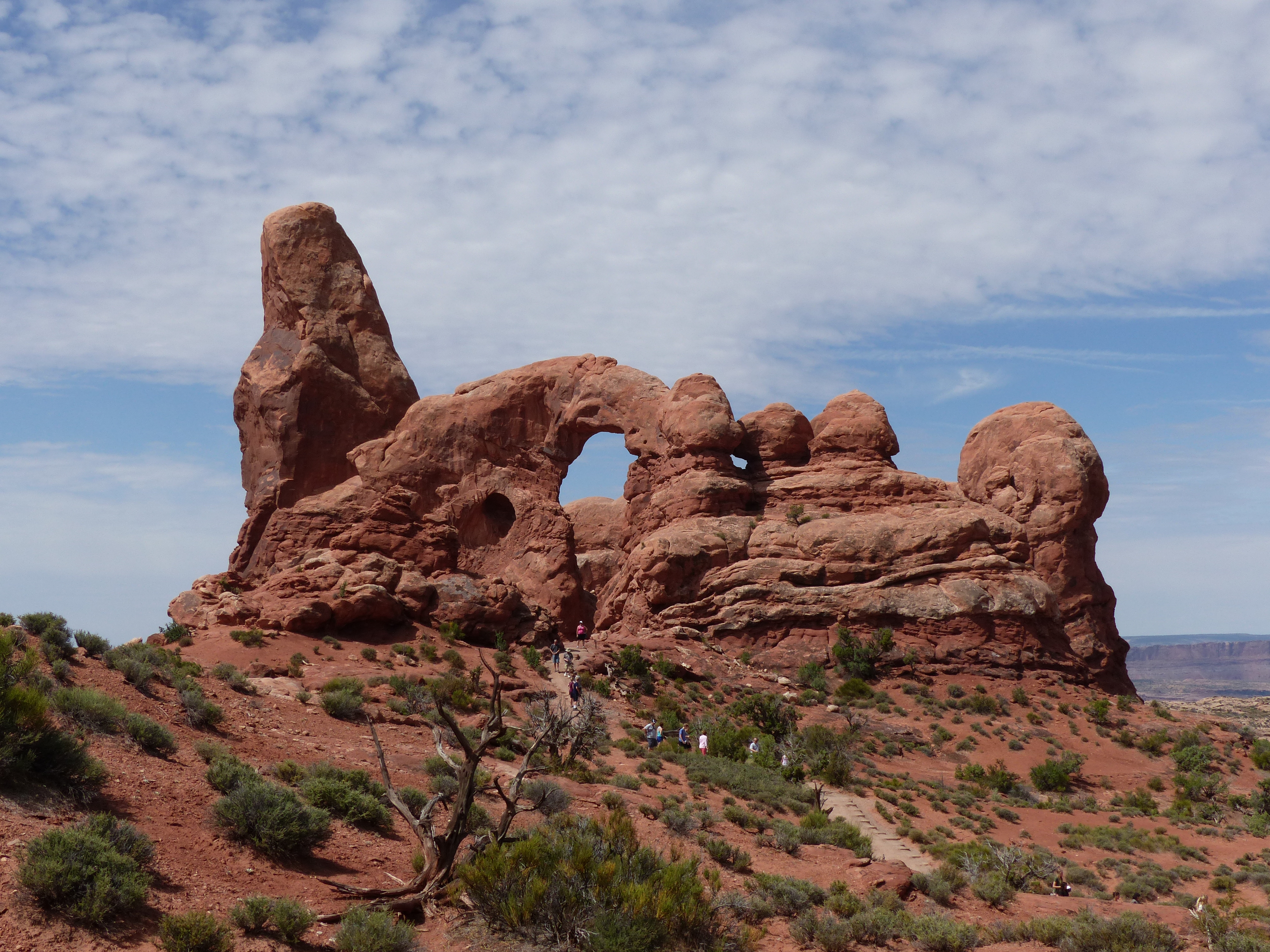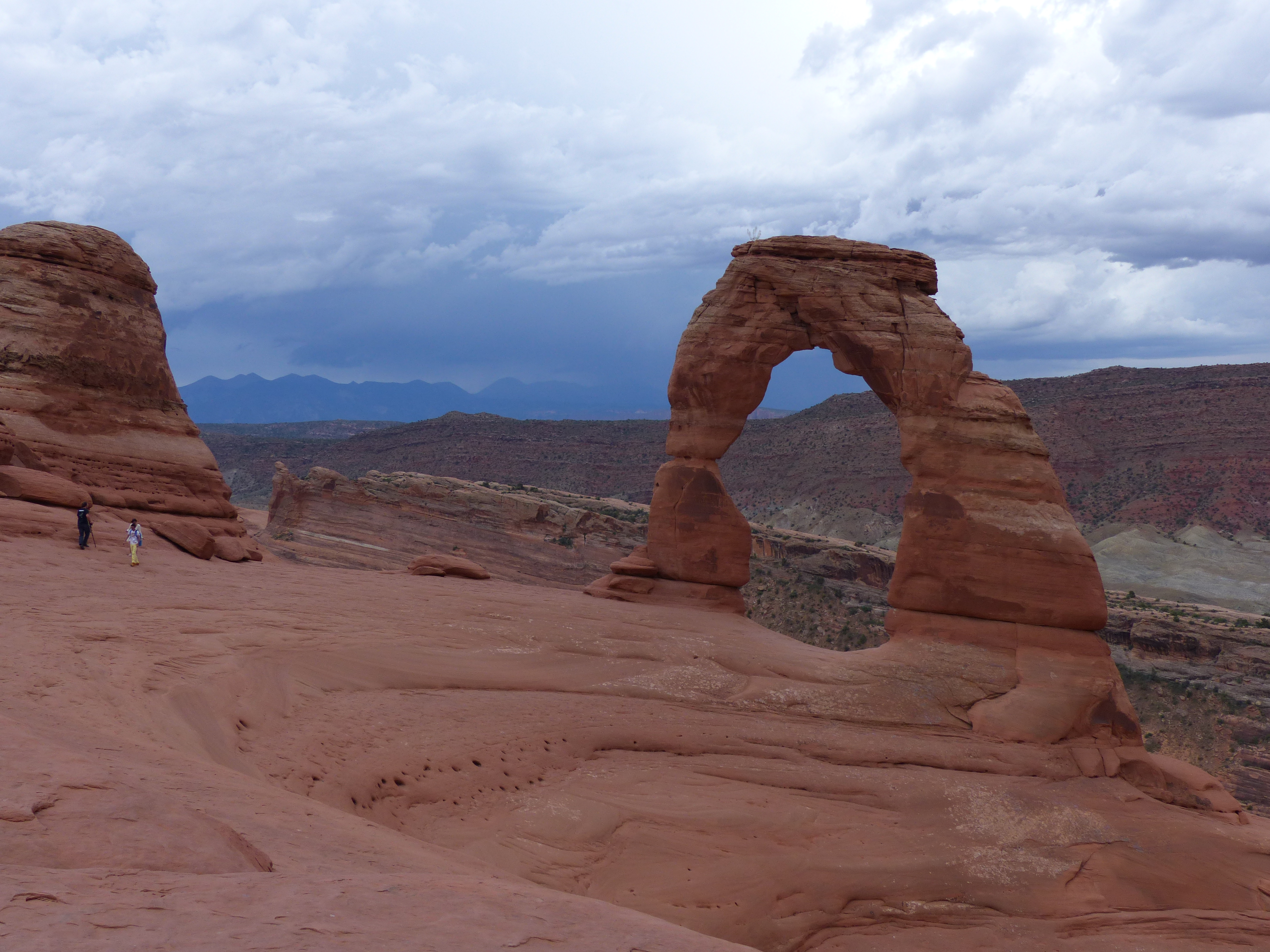 A Moab e’ anche stata inaugurata una piccola tradizione, quella del temporale pomeridiano/serale: da un lato benvenuta, per le temperature finalmente fresche, dall’altro un po’ rompiscatole, la luce del pomeriggio non e’ mai quella giusta per apprezzare gli splendidi colori di queste rocce e la prima sera abbiamo anche rischiato di beccarci il temporale in pieno prima di arrivare al ristorante. Siamo comunque riusciti a passare mezza giornata ad Arches, altro splendido parco caratterizzato da rocce dalle forme particolari, come la Balanced Rock qui sotto, e dalla presenza di 2.000 archi naturali di roccia; noi naturalmente ne abbiamo visti solo 5 o 6, i piu’ famosi:
