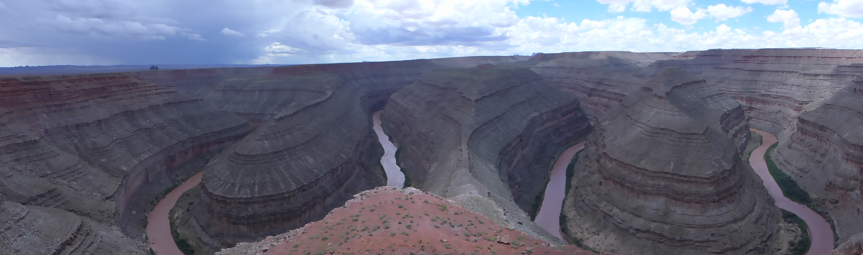 Il giorno dopo ci attende Antelope Canyon, una meraviglia della natura scavata dalle piogge e dalla sabbia; il tour prenotato è alle 13, arriviamo un po’ troppo in anticipo causa piccolo errore di pianificazione oraria (i cambi di ora tra stato e stato, in questo caso Utah e Arizona, tendono ad essere facili da dimenticare…) e visto il cielo temporalesco il “simpatico” navajo che gestisce il tutto ci dice di leggere bene le condizioni di annullamento…cominciamo male! E in effetti il tour viene poi annullato per il pericolo di inondazione improvvisa causa temporale…maledetta nuvola fantozziana! Ci consoliamo con un’occhiata alla diga del lago Powell e, per i soliti temerari che sfidano la pioggia del pomeriggio, ad una particolare ansa del Colorado river: