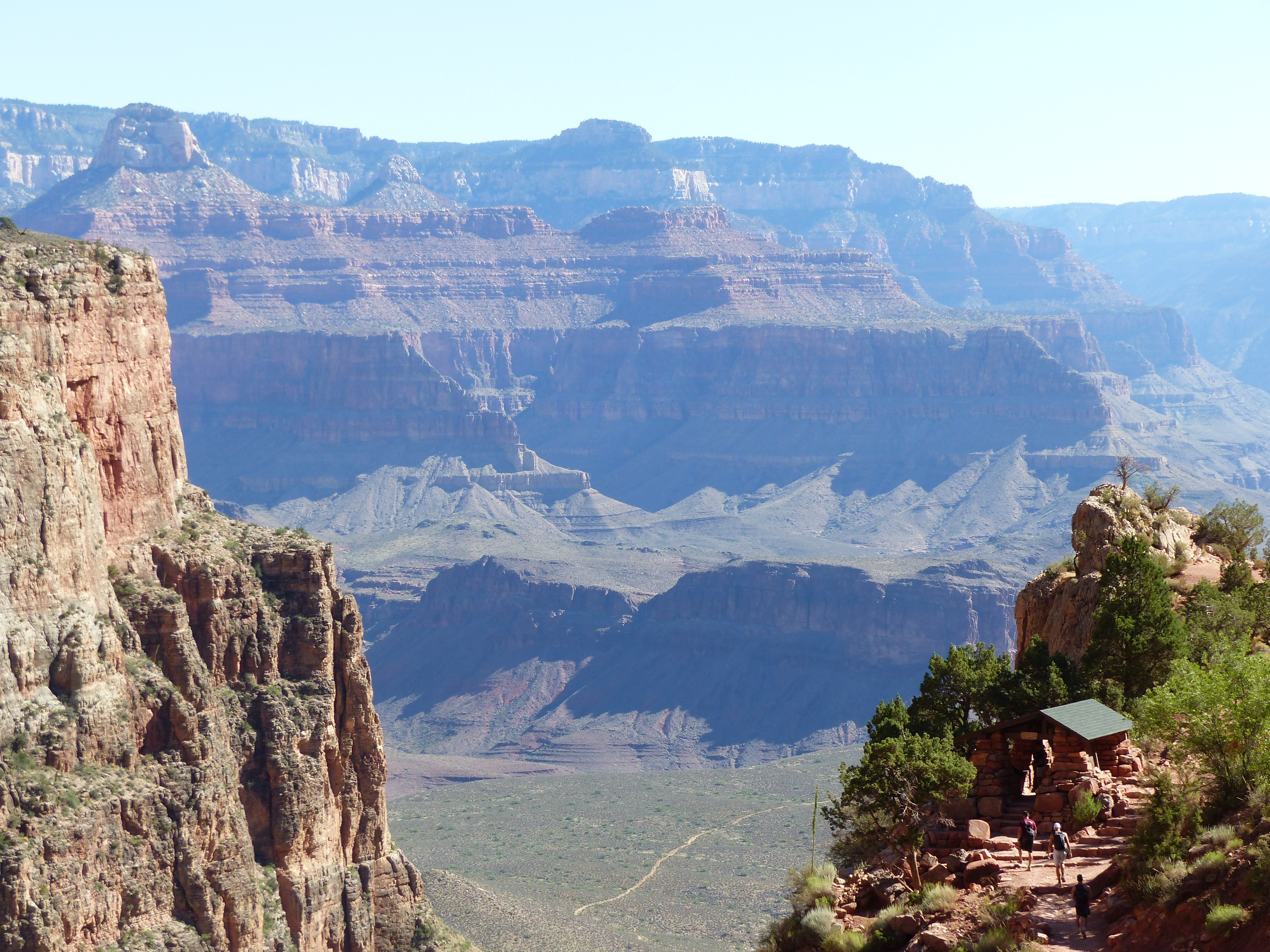 Fatto sta che la mattina dopo l’arrivo solo tre coraggiosi (Papa’ Sognatore, Mamma Paziente e il loro primogenito) si lanciano nell’impresa di percorrere una parte del Bright Angel Trail, uno dei sentieri piu’ famosi che scende nelle viscere del Canyon, e tornare prima dell’orario del check-out dall’albergo, le 11, andando alla ricerca di viste e paesaggi diversi da quelli che si vedono stando sul bordo in alto.