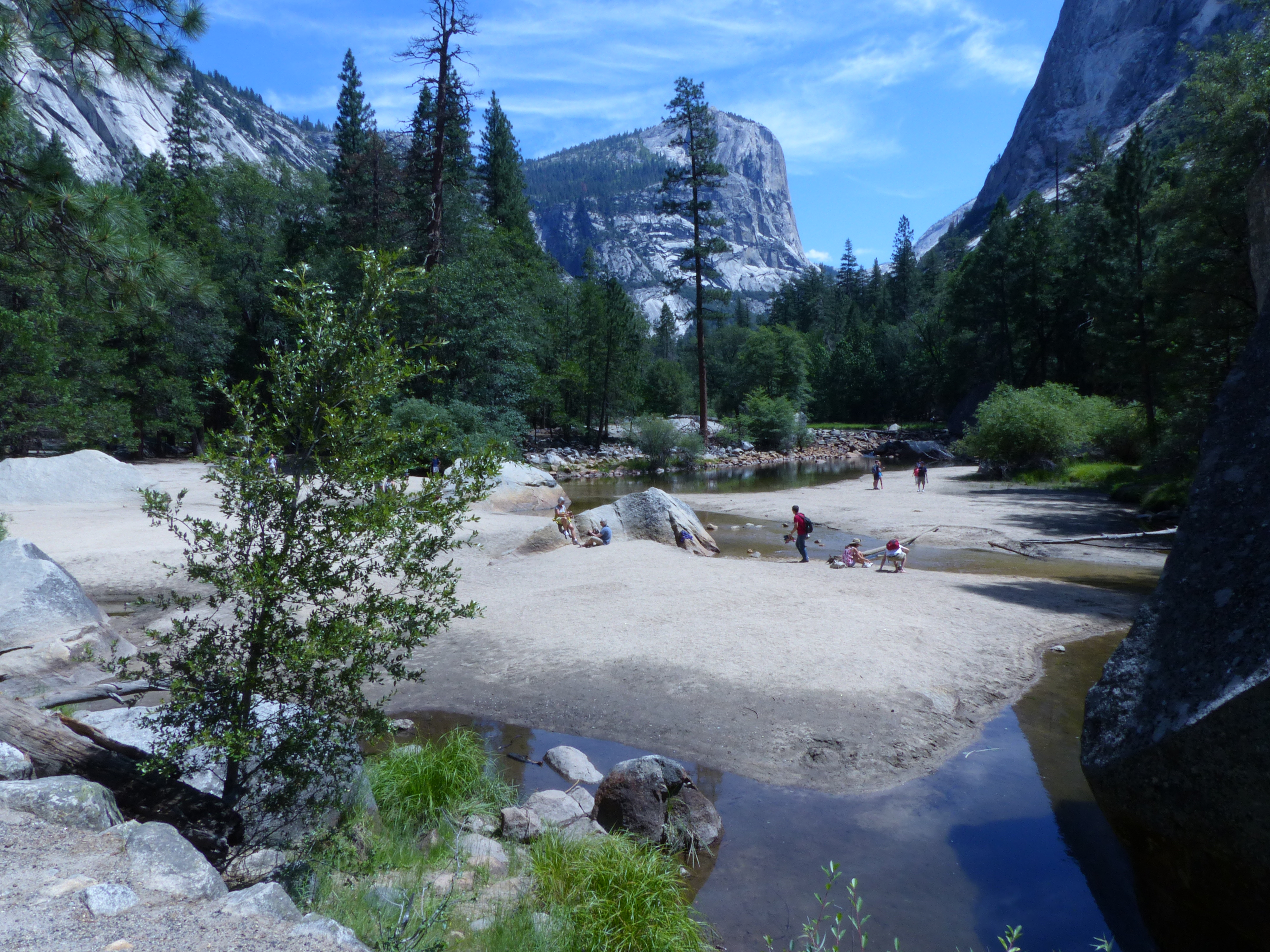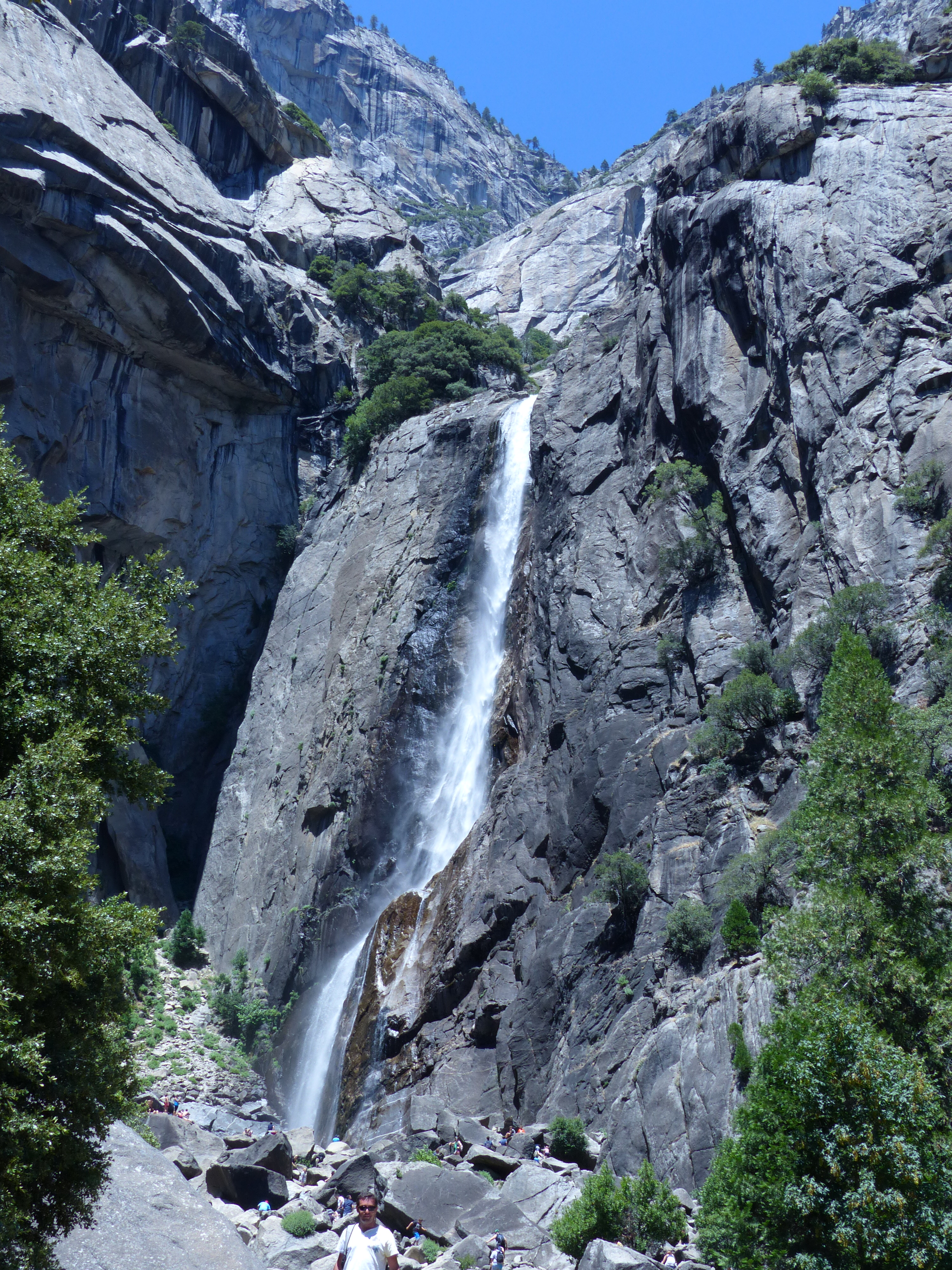 Ben diverso invece l’impatto con la valle vera e propria: passati un paio di tunnel ci si trova in una valle verdissima circondata da pareti di granito a volte quasi verticali che mettono veramente in soggezione, il tutto impreziosito da un fresco torrente che scorre al centro, da cascate sulle pareti e da un laghetto in fondo alla valle…un paesaggio che se non fosse per la quantita’ di turisti che riempiono tende e ristoranti farebbe venire voglia di restarci una settimana, altro che “la solita notte”.